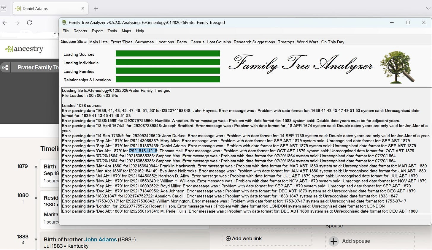 It’s free, for Windows 11, and has an easy to understand interface. You just open a Gedcom file. So I downloaded my Ancestry tree - because that’s where I keep things recorded and sandbox - and then opened it in FTAnalyzer.